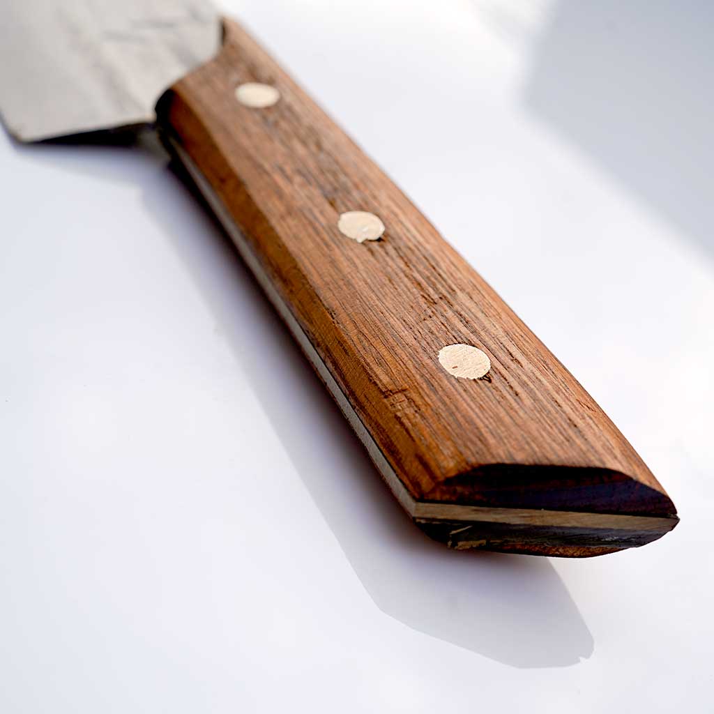 Die Klingengeometrie des Mukimono Hōchō des ähnlich der des Usaba. Das handgeschmiedete japanische Küchenmesser hat eine von oben nach unten angeschrägte abgeschnittene Spitze ganz wie eine Tantoklinge. Wenn Du am Grill oder mit einer unbeschichteten Eisenpfanne arbeitest, kannst Du dieses Messer auch zum Wenden deines Bratengutes nutzen.